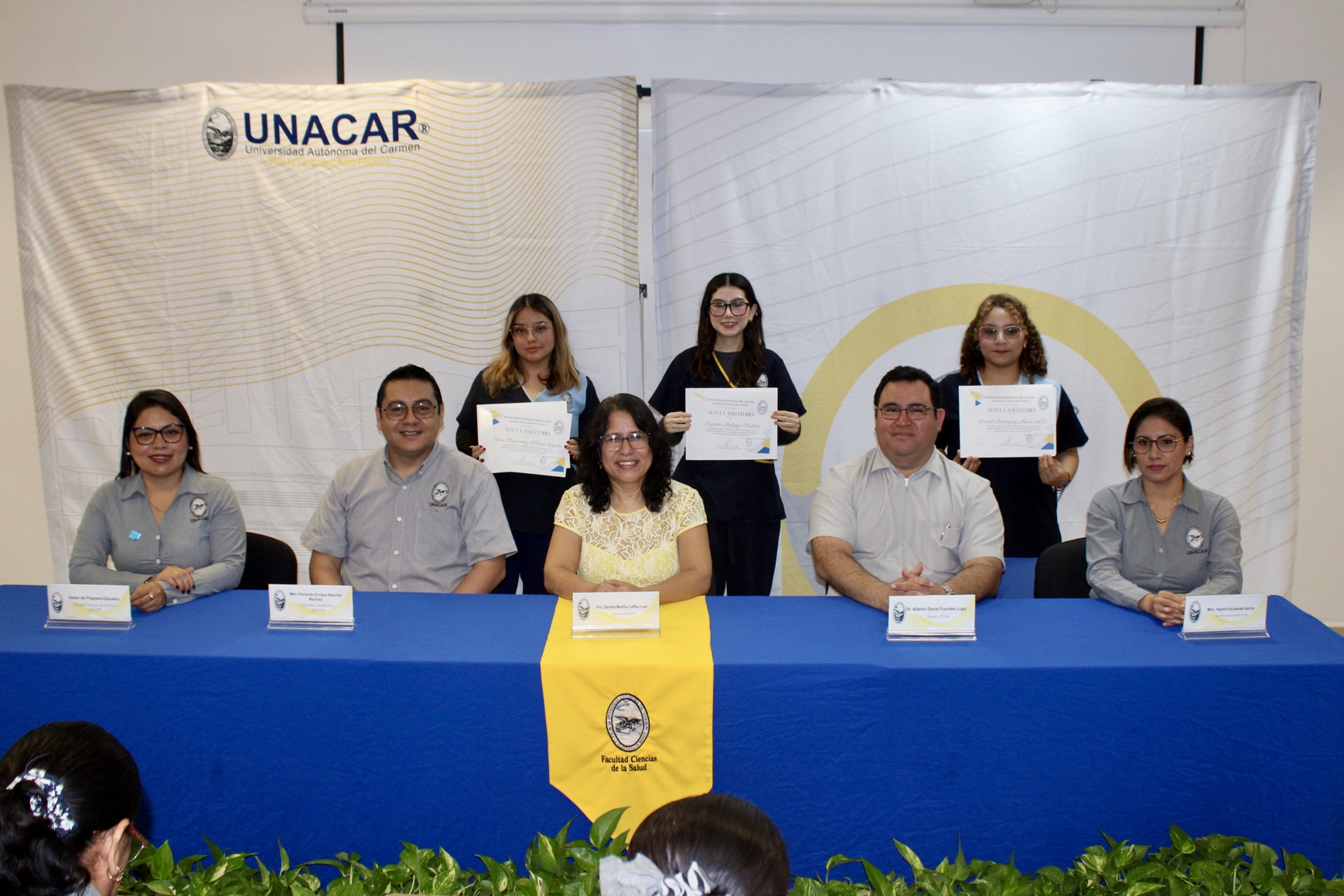 Asistieron al acto realizado en el sala 257 el Dr. Fernando Enrique Sánchez Martínez, secretario académico; Dr. Alberto Daniel Fuentes Lugo y Mtra. Yasmin Escalante García, director y secretaria administrativa de la FCS, respectivamente; Dr. José Jesús Matos Ceballos, gestor de LEFyD; Mtra. Airam Anerim Guillén Suárez, gestora de Nutrición; Mtra. Shiray González Pérez, gestora de Psicología; Mtra. Leidy Sofia Javier Rivera, gestora de Fisioterapia; y Dr. Juan Yovani Telumbre Terrero, gestor de Enfermería.