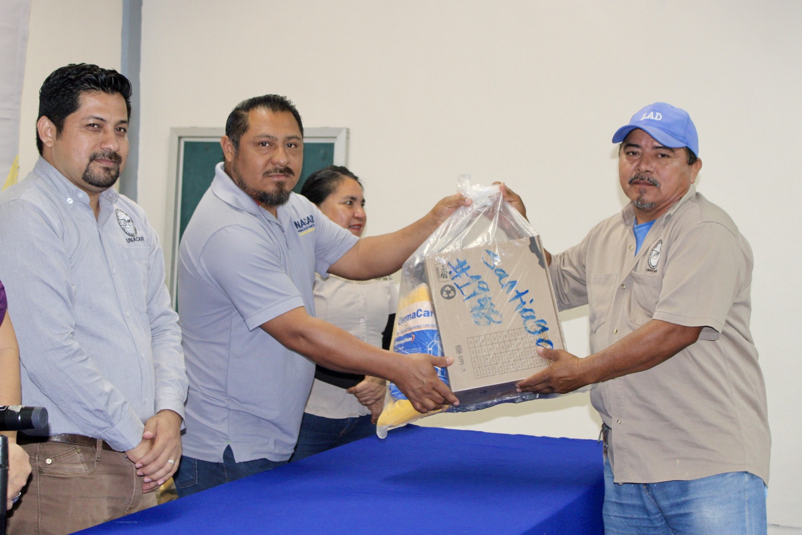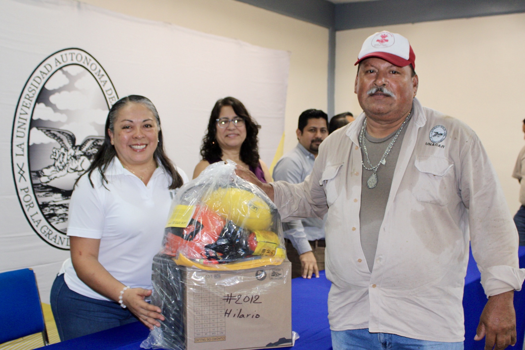 Autoridades universitarias y sindicales, encabezadas por la rectora Dra. Sandra Martha Laffon Leal y el Ing. Ramón López López, secretario general del Sindicato Único de Trabajadores de la Universidad Autónoma del Carmen (SUTUNACAR), entregaron equipo de protección personal (EPP) a 143 trabajadores adscritos a la Coordinación General de Obras, los Departamentos de Mantenimiento y Talleres y de Servicios Generales, como lo establece la Cláusula 31 del Contrato Colectivo de Trabajo.