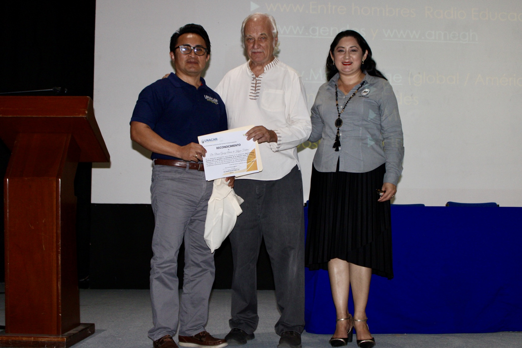 La Mtra. Erika Sánchez Chablé, coordinación de RSU, y el Dr. Rafael Sánchez Lara, director de la Facultad de Ingeniería y Arquitectura, entregaron reconocimiento al Dr. Benno George Álvaro De Keijzer Fokker, quien es una de las voces más influyentes en México sobre temas de masculinidades, género y prevención de la violencia. Su trabajo promueve la construcción de relaciones igualitarias, respetuosas y libres de violencias, aportando herramientas prácticas para transformar nuestra convivencia dentro y fuera de los espacios universitarios.