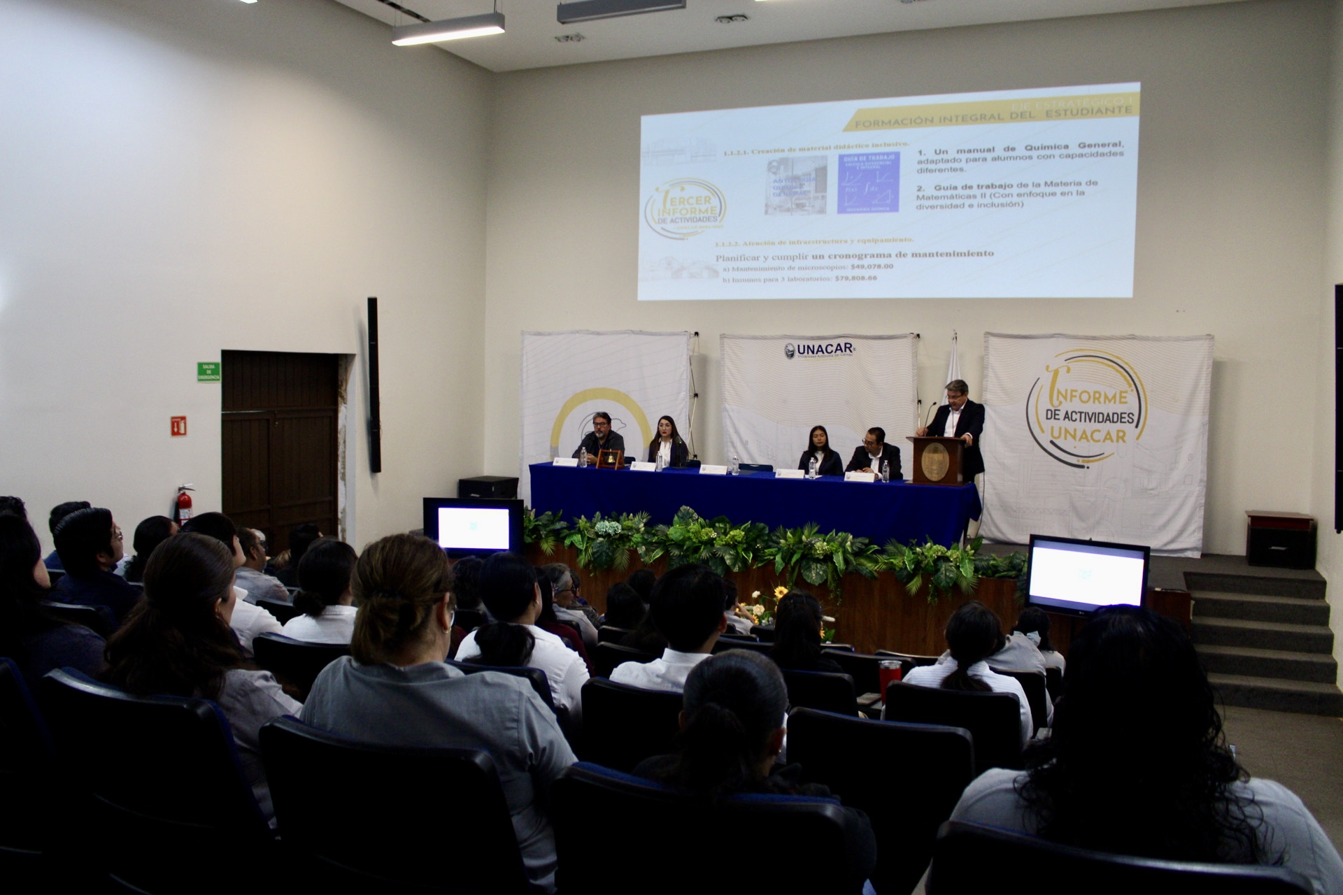 Ante autoridades universitarias, directores, profesores y estudiantes, Ruiz Marín describió que en el Eje Estratégico 1, desde 2023 se ha incrementado la matrícula de los tres programas educativos que se ofertan, mediante estrategias como invitaciones a preparatorias, cursos y talleres, con un fuerte apoyo de las academias y el Comité de Técnicos de Laboratorio para atraer a jóvenes egresados del nivel medio superior.