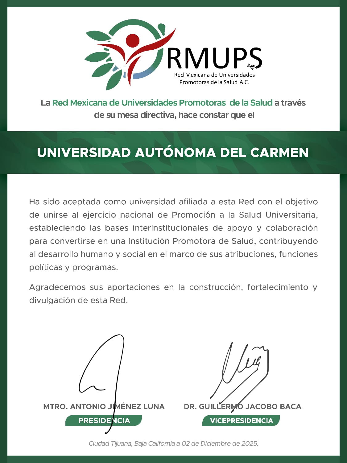 La Universidad Autónoma del Carmen (UNACAR) fue aceptada formalmente como institución afiliada a la Red Mexicana de Universidades Promotoras de la Salud (RMUPS), fortaleciendo su compromiso institucional con la promoción de la salud, el bienestar integral y el desarrollo humano de su comunidad universitaria.