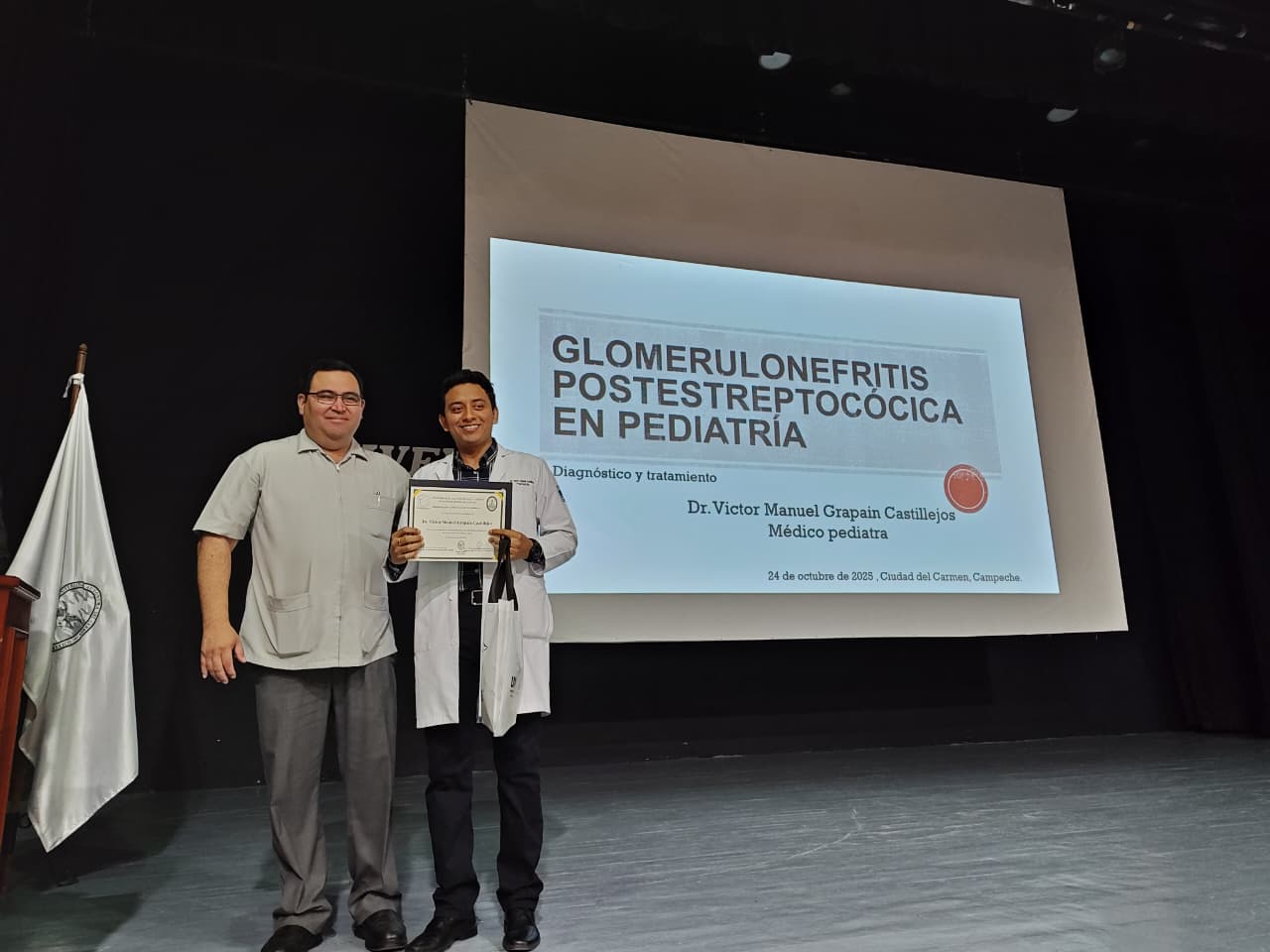 El evento inició con la participación del Dr. Víctor Manuel Grapain Castillejos, pediatra egresado de la primera generación de la Licenciatura en Medicina de la UNACAR, quien ofreció la conferencia titulada “Glomerulonefritis postestreptocócica en el paciente pediátrico: abordaje, diagnóstico y tratamiento”.