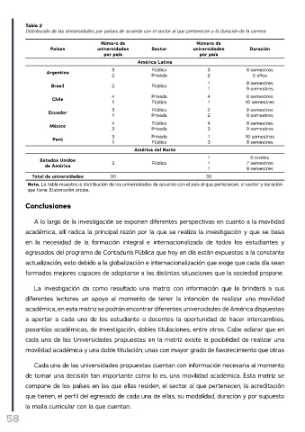 Nota. La tabla muestra la distribución de las universidades de acuerdo con el país al que pertenecen, el sector y duración