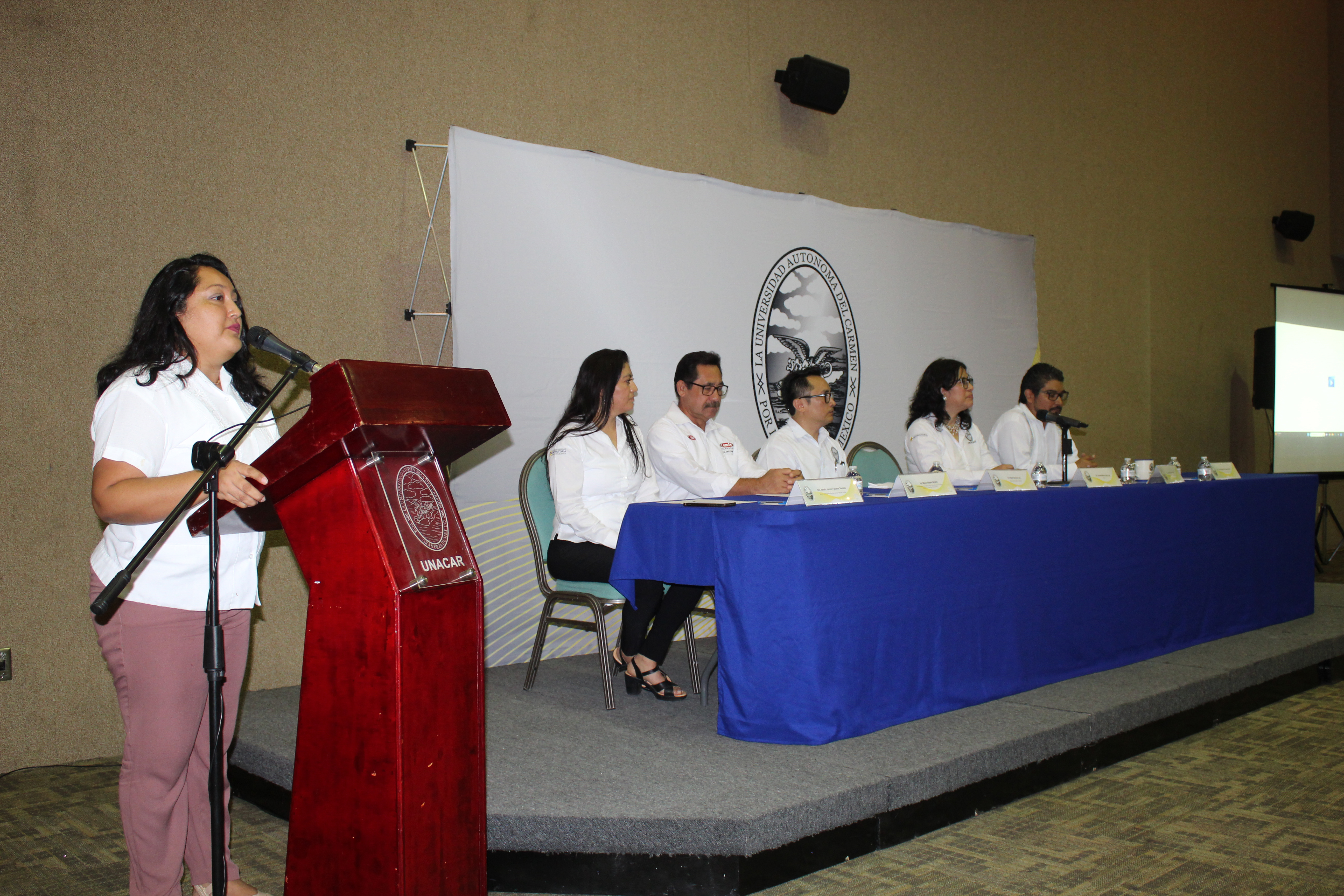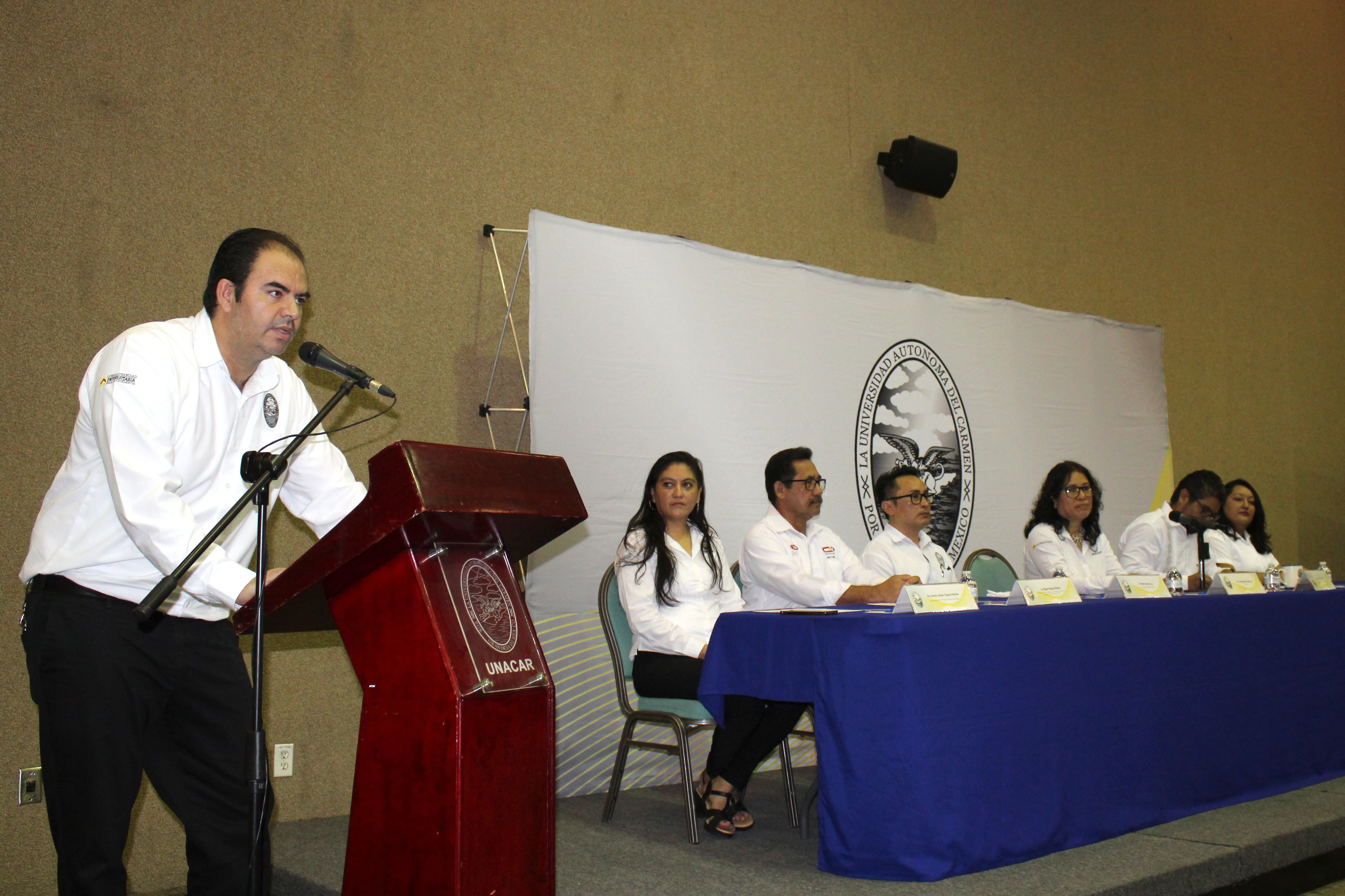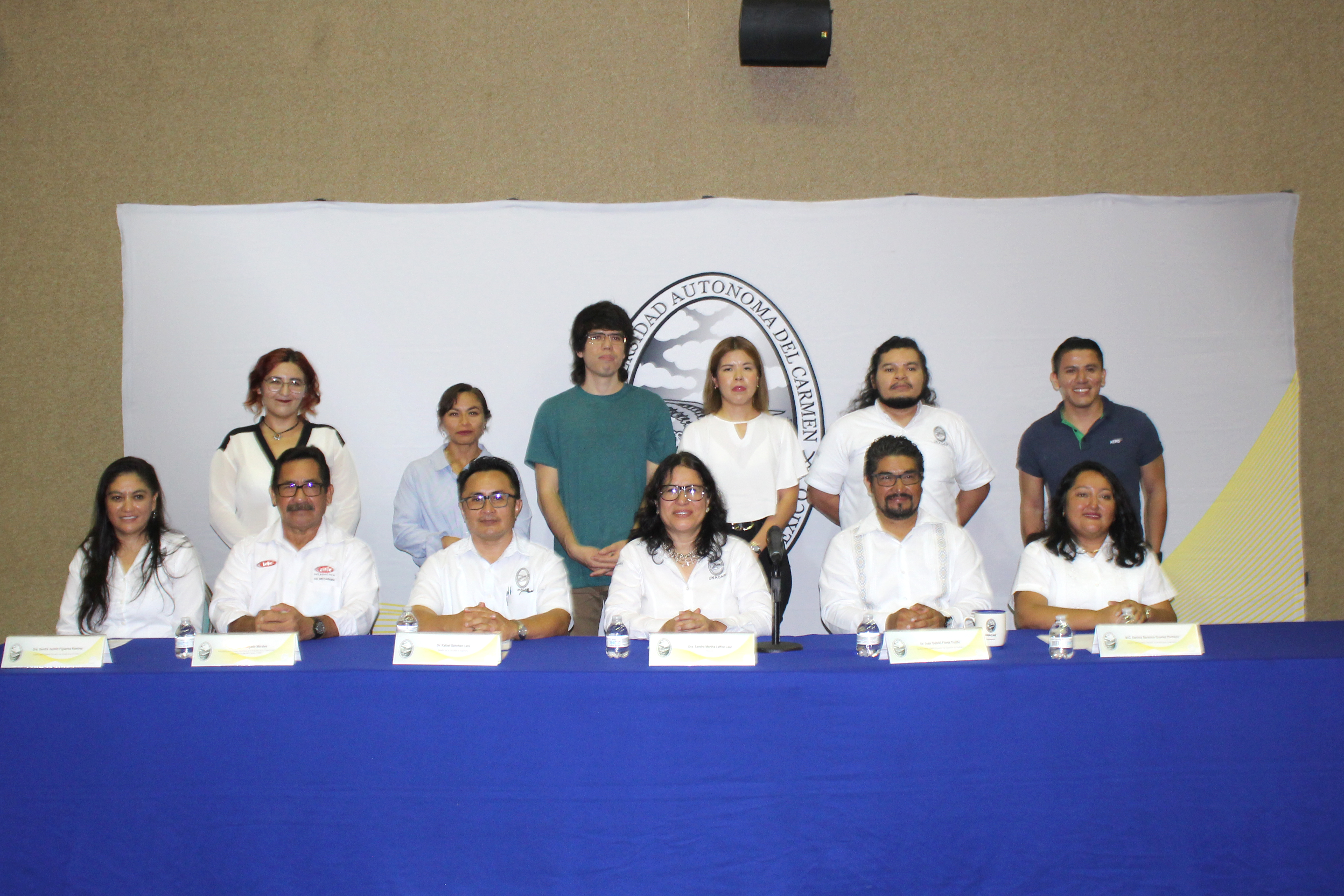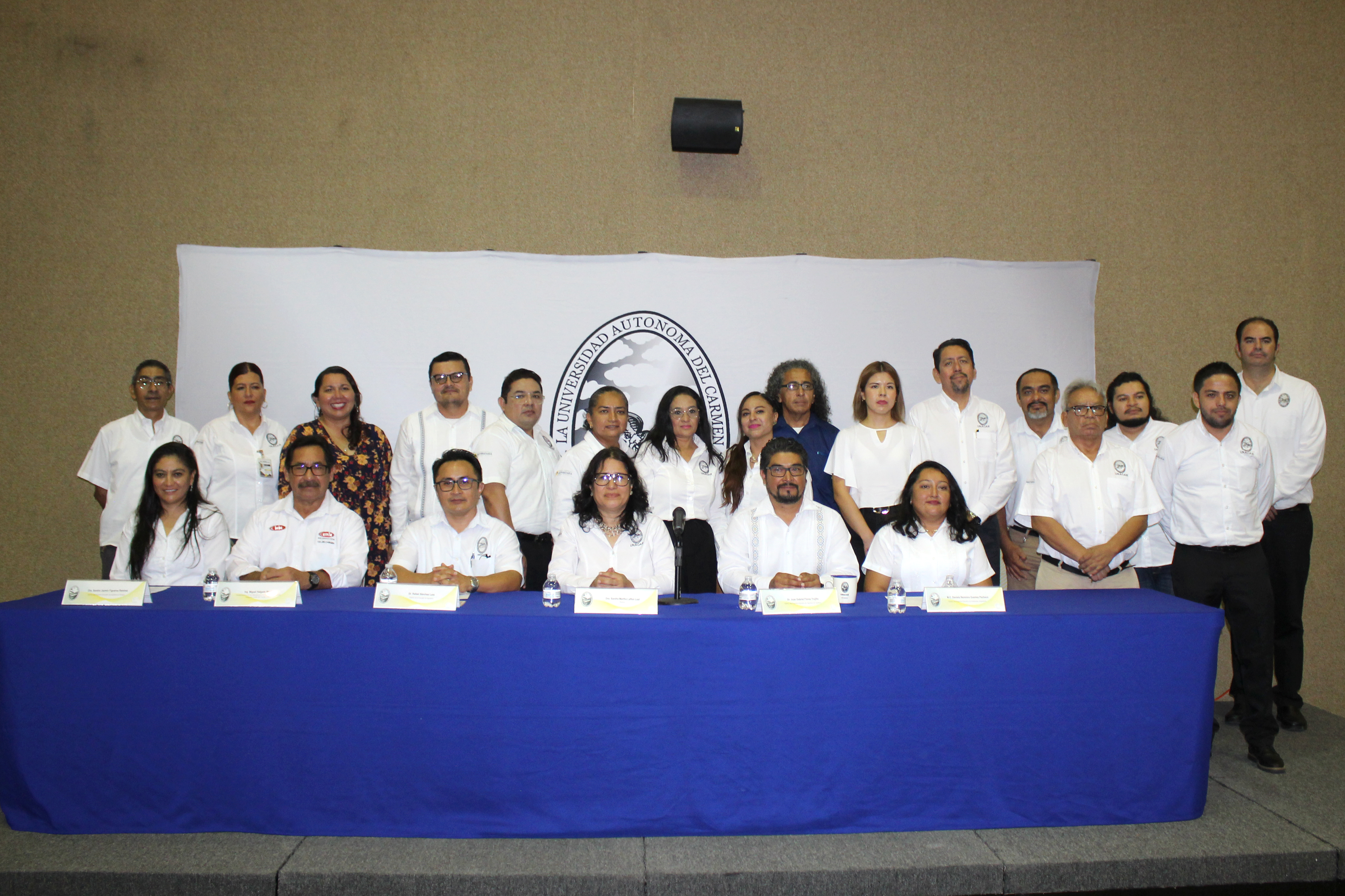 Acudieron el Arq. Marco Antonio Sánchez Heredia, tesorero del Comité Directivo de la Cámara Mexicana de la Construcción CMIC Delegación Ciudad del Carmen; Dra. Sandra Jazmín Figueroa Ramírez, gestora de Ingeniería en Energía; Ing. David Alexander Benavides Zadorozhna, estudiantes destacado de la Maestría en Ingeniería en Energía; Ing. Daniela Benítez Coc, representante de Andamios Bluepower; Ing. Ernesto Zapata Jácome, presidente del Colegio de Arquitectos del Carmen; e Ing. Carlos Alpuche, presidente del Colegio de Ingenieros Mecánicos Electricistas del Golfo.