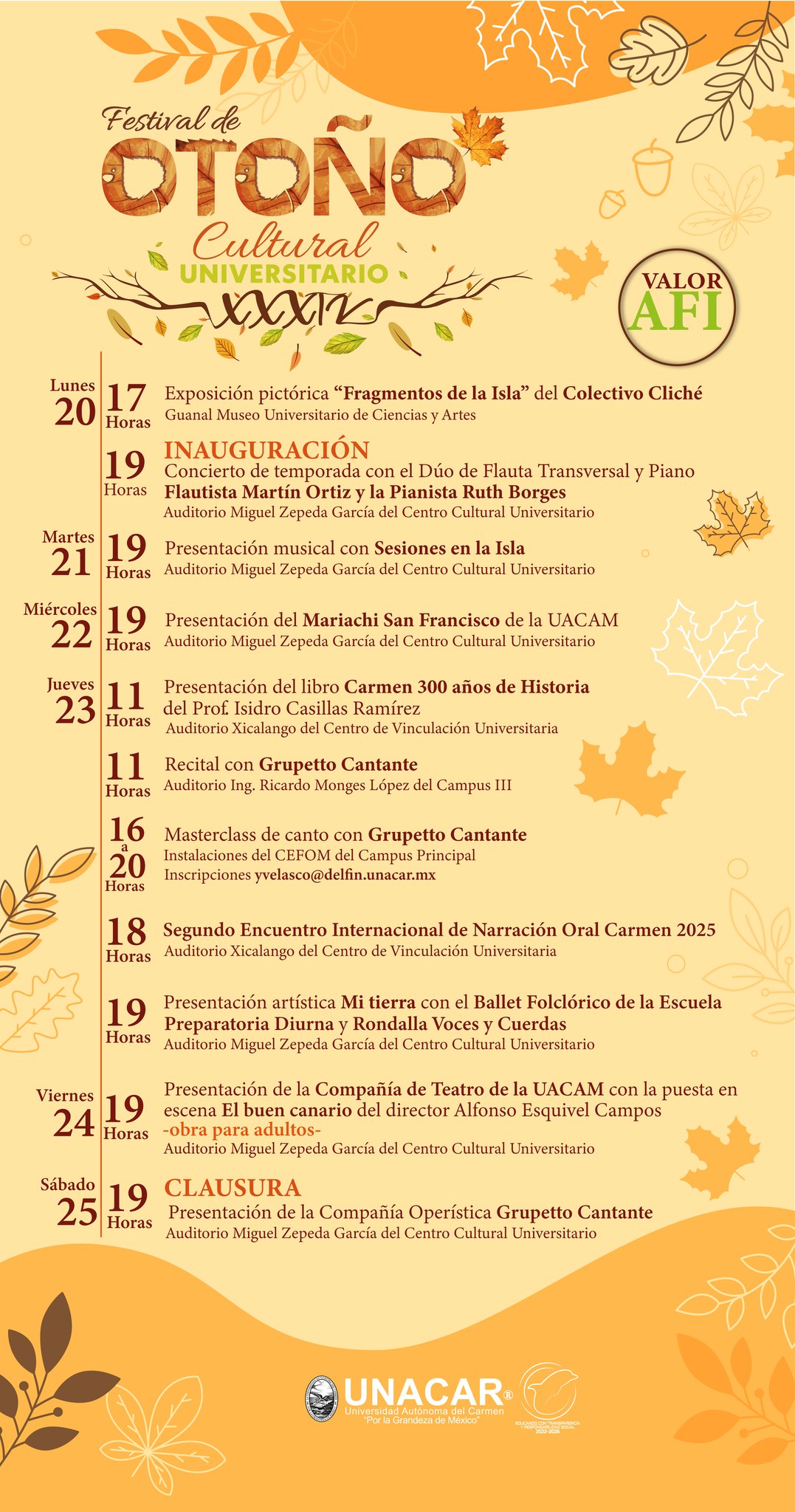 Un total de 11 actividades artísticas, distribuidas del 20 al 25 de octubre, conforman el trigésimo cuarto Festival Otoño Cultural Universitario que organiza la Universidad Autónoma del Carmen (UNACAR), a través de la Dirección General de Extensión Universitaria y la Dirección de Difusión Cultural.