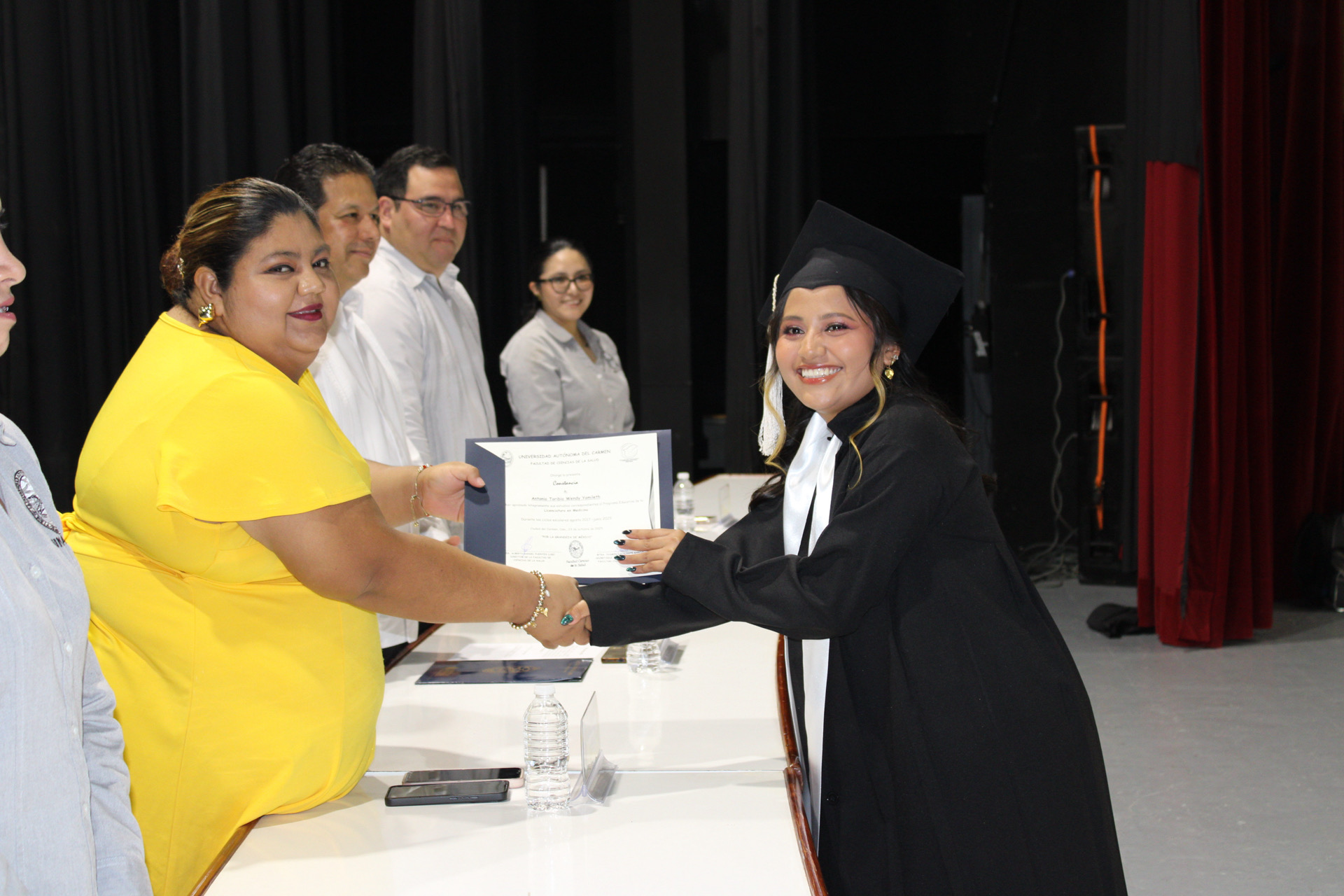 Entregaron además reconocimientos a los mejores promedios de la generación 2020 – 2025: Arleni Vergara Ramos, Gemma Guadalupe Pérez Jiménez y Angelina Sánchez Peraza, quien a nombre de sus compañeros de generación emitió un mensaje de agradecimiento a los profesores, gestores y a sus familiares por el apoyo recibido durante la formación universitaria.