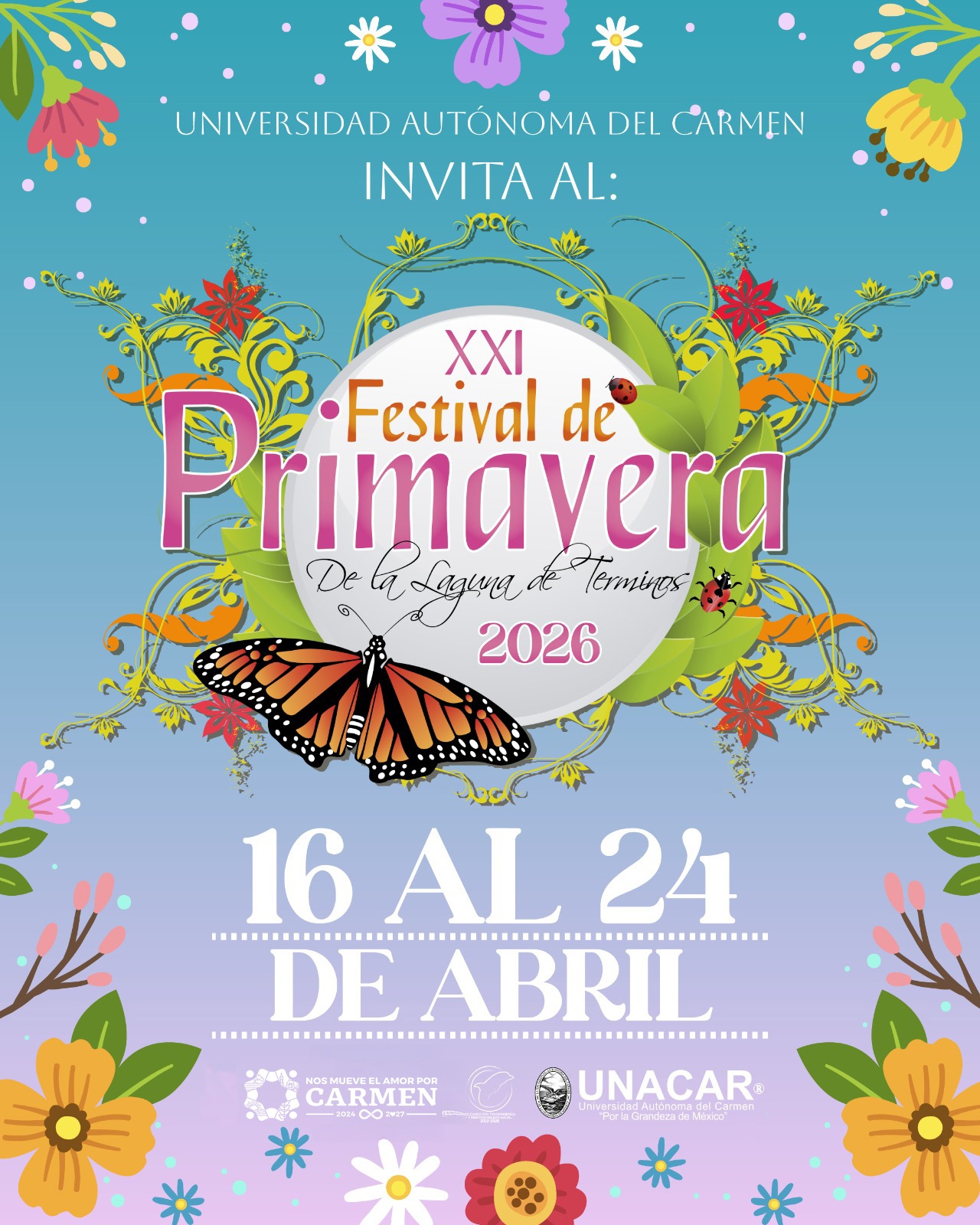 La vigésimo primera edición del Festival de Primavera de la Laguna de Términos se realizará del 16 al 24 de abril, dos fines de semana donde la comunidad universitaria y el público en general podrá disfrutar la variedad de géneros musicales en distintos escenarios universitarios y de la isla. Organizado por la Universidad Autónoma del Carmen (UNACAR), a través de la Dirección de Difusión Cultural y en colaboració...