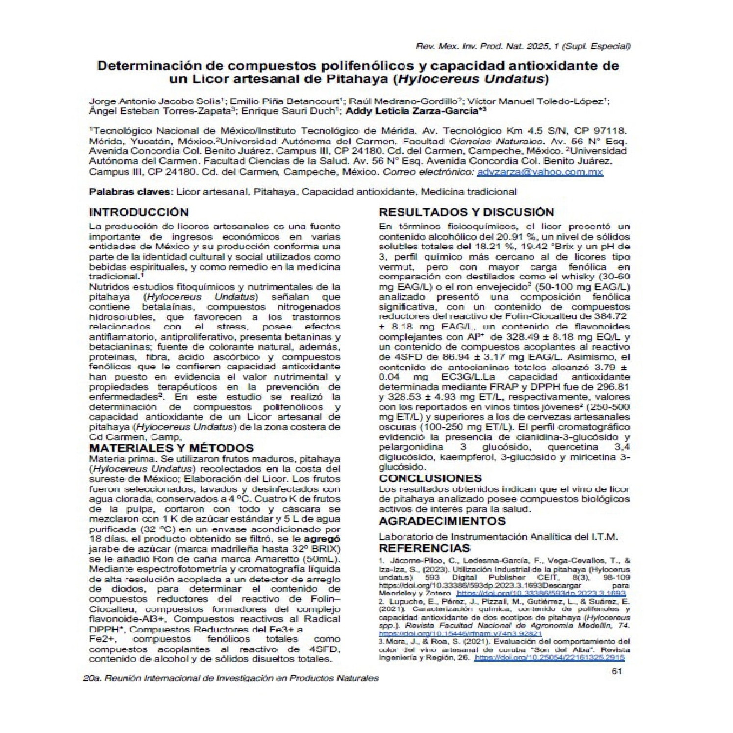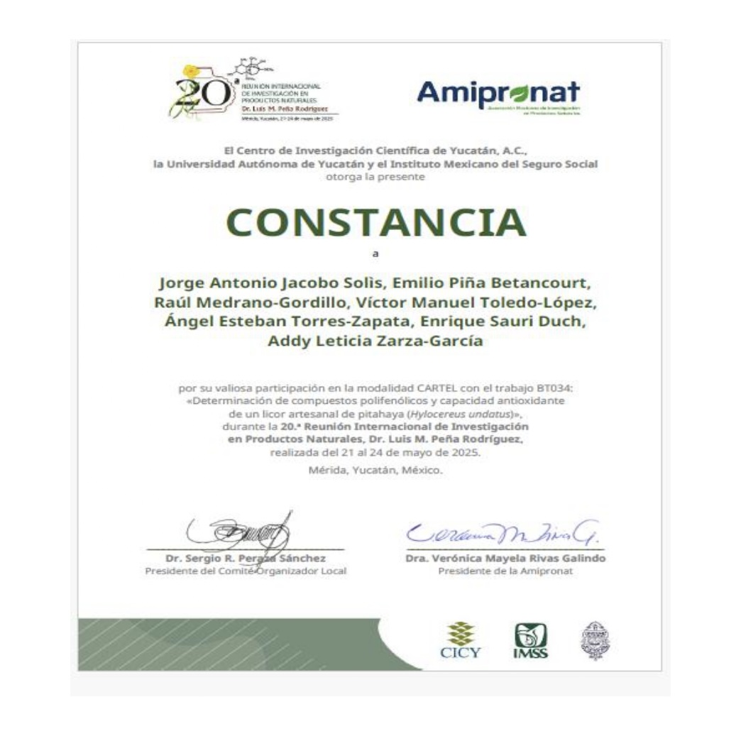 La Red Grupo de Investigación Multidisciplinaria Orientada a la Ciencia de los Alimentos y Biotecnología, integrada por Cuerpos Académicos de la Universidad Autónoma del Carmen (UNACAR) y el Tecnológico Nacional de México, campus Mérida, presentó un destacado trabajo en la 20ª Reunión Internacional de Investigación de Productos Naturales celebrada en Mérida, Yucatán, del 21 al 24 de mayo de 2025.