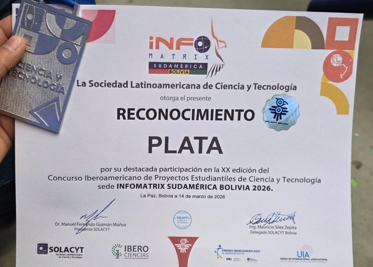 Daniela Paola Veruete Macías, estudiante de la Licenciatura en Biología Marina; y su asesor el Mtro. Aldrin Chan Pat, de la Facultad de Ciencias Naturales; ganaron la Medalla de Plata entre 20 equipos en la categoría Ciencia Aplicada con el proyecto “Bloqueador Solar Marino” en Infomatrix Sudamérica llevada a cabo en la Ciudad de La Paz, Bolivia del 13 al 15 marzo.
