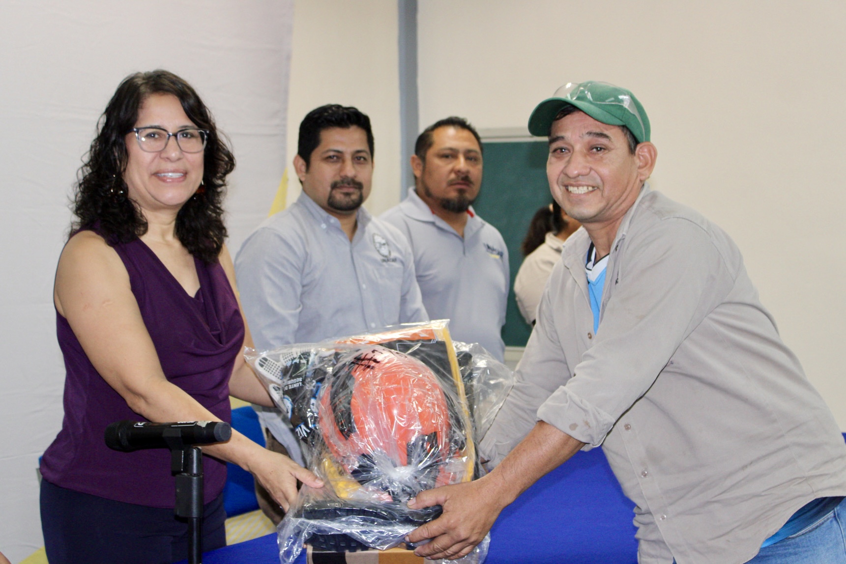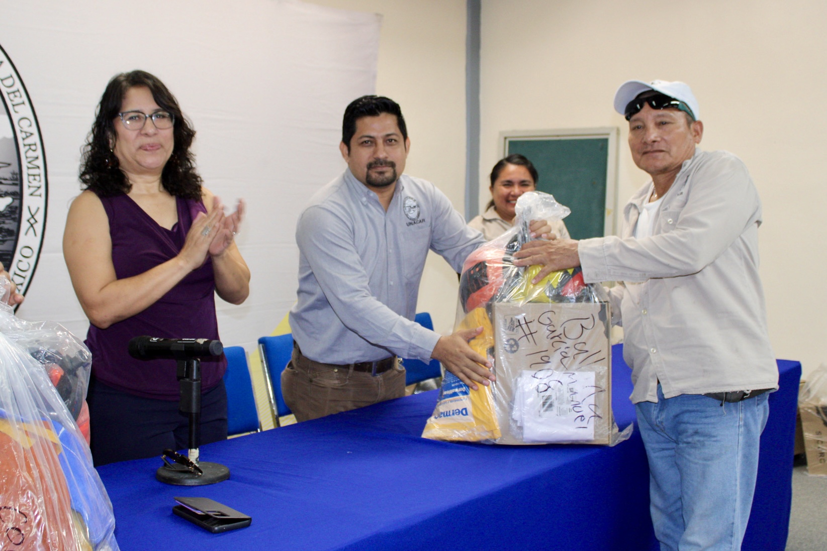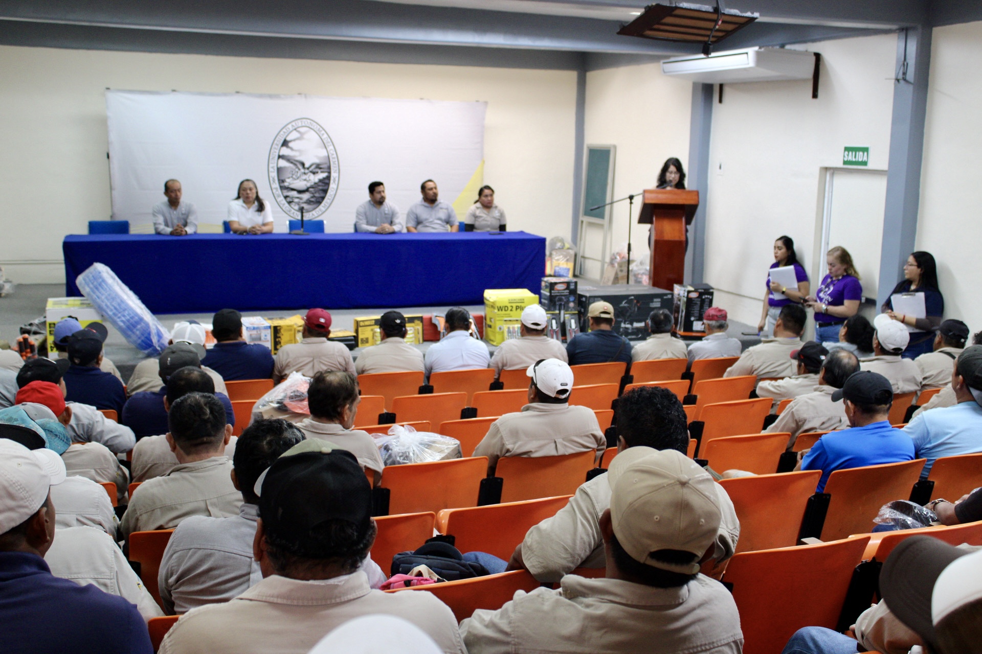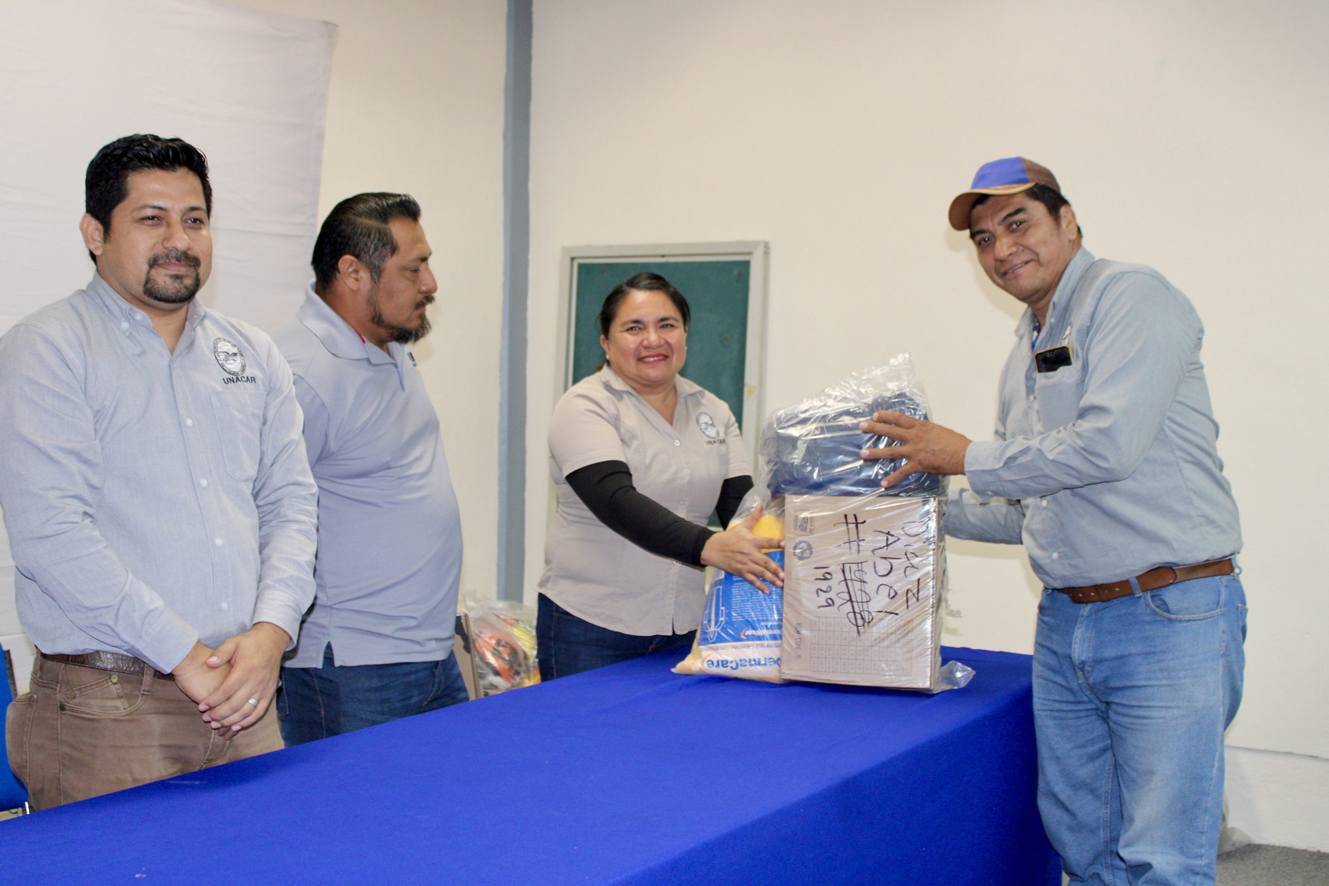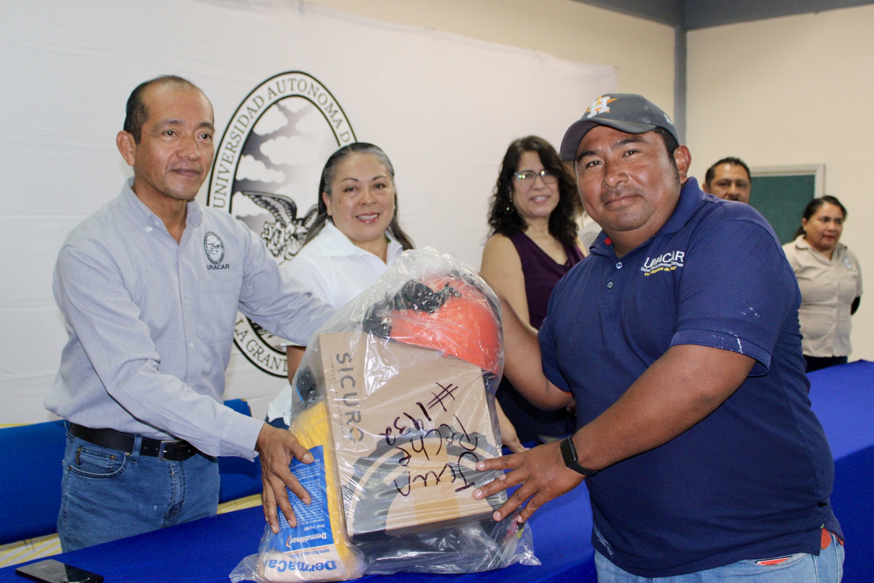 Autoridades universitarias y sindicales, encabezadas por la rectora Dra. Sandra Martha Laffon Leal y el Ing. Ramón López López, secretario general del Sindicato Único de Trabajadores de la Universidad Autónoma del Carmen (SUTUNACAR), entregaron equipo de protección personal (EPP) a 143 trabajadores adscritos a la Coordinación General de Obras, los Departamentos de Mantenimiento y Talleres y de Servicios Generales, como lo establece la Cláusula 31 del Contrato Colectivo de Trabajo.