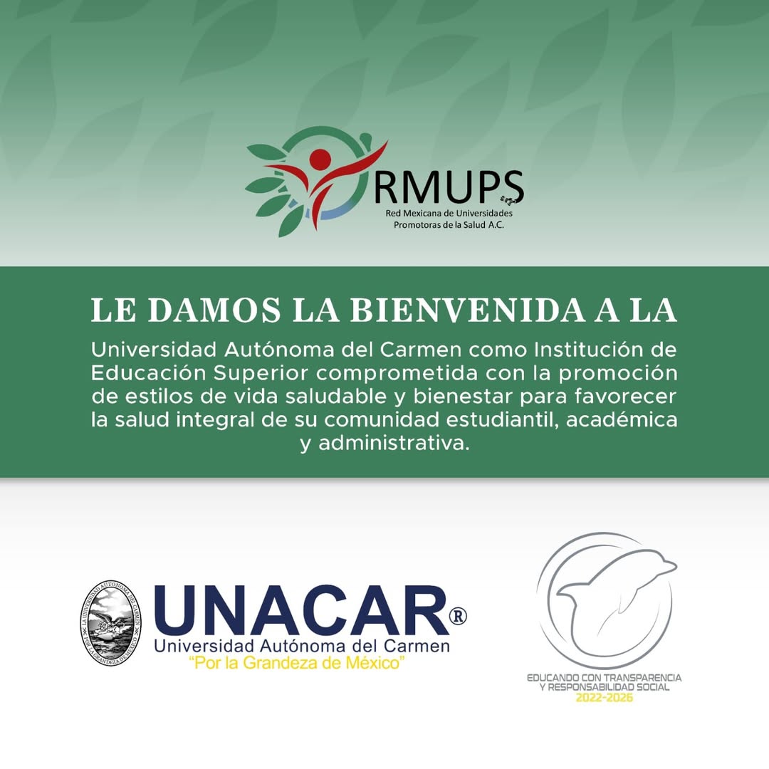 La Universidad Autónoma del Carmen (UNACAR) fue aceptada formalmente como institución afiliada a la Red Mexicana de Universidades Promotoras de la Salud (RMUPS), fortaleciendo su compromiso institucional con la promoción de la salud, el bienestar integral y el desarrollo humano de su comunidad universitaria.