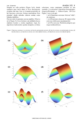 función cóncava, (e) función no convexa con varios óptimos locales, y (f) función no convexa sin solución óptima.