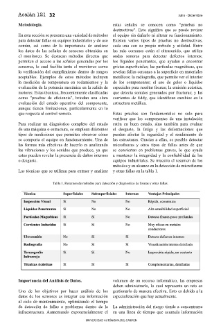 Tabla 1. Resumen de métodos para detección y diagnostico de f suras y otras fallas.