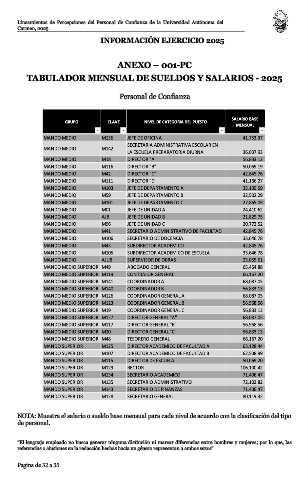 NOTA: Muestra el salario o sueldo base mensual para cada nivel de acuerdo con la clasificación del tipo