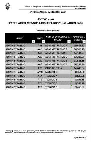 TABULADOR MENSUAL DE SUELDOS Y SALARIOS 2025