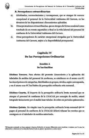 pague al personal de confianza de la UNACAR deberá rebasar los montos que se