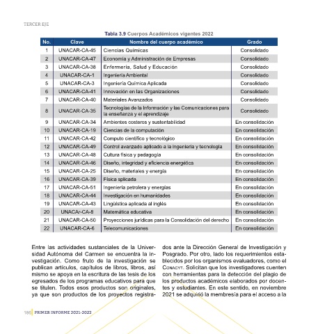 Tabla 3.9 Cuerpos Académicos vigentes 2022