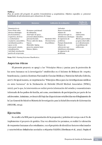 Plan de acción del proyecto de gestión Conociéndome y aceptándome. Objetivo específico 3: potenciar