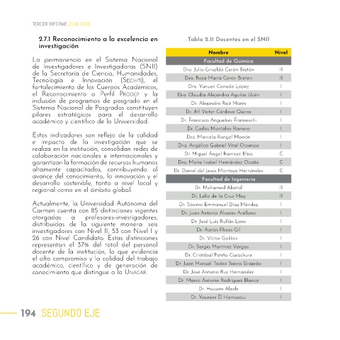 2.7.1 Reconocimiento a la excelencia en Tabla 2.11 Docentes en el SNII