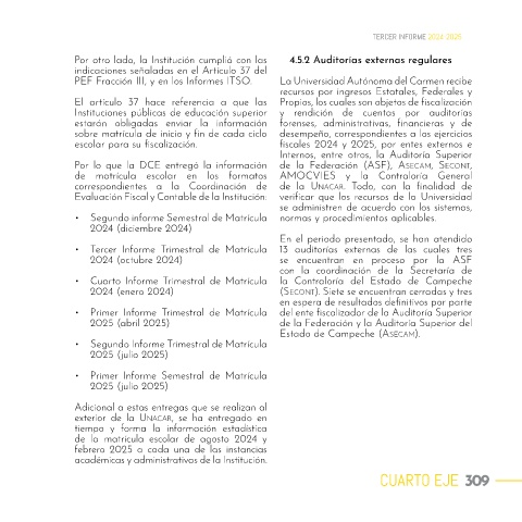 Por otro lado, la Institución cumplió con las 4.5.2 Auditorías externas regulares