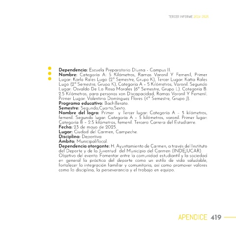 Nombre del logro: Primer y Tercer lugar: Categoría A – 5 kilómetros,