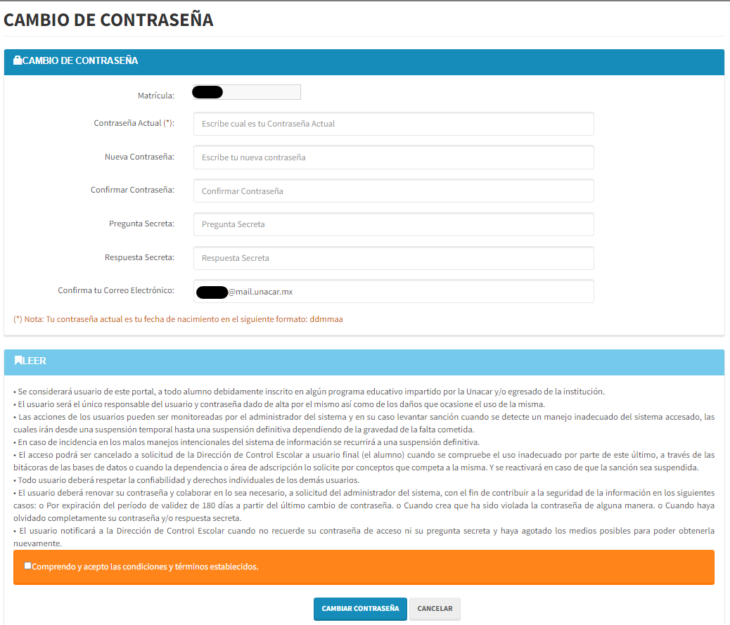 - Tu usuario y contraseña actual (matrícula y fecha de nacimiento).